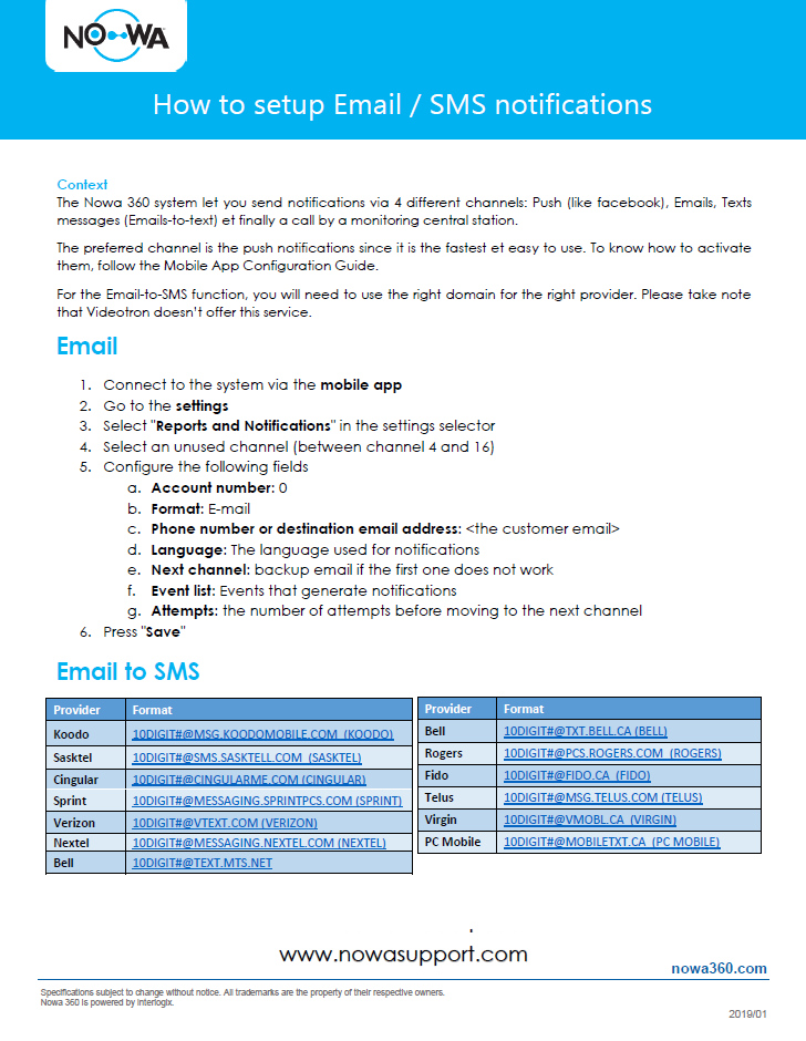 This document explains how to configure email or SMS notifications in the Nowa 360 system.