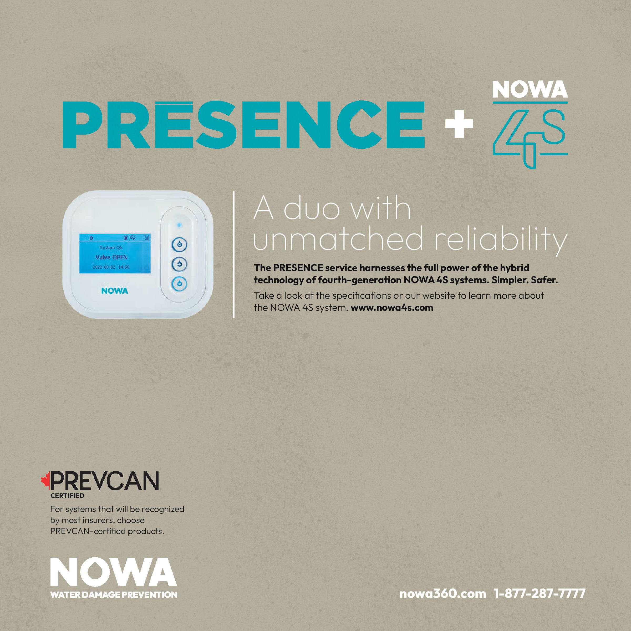 Access the latest document from February 2025, detailing the PRESENCE service plan and mobile app features for water damage prevention with NOWA 4S. Or, you can read everything about PRESENCE by NOWA from our brand web pages listed here: