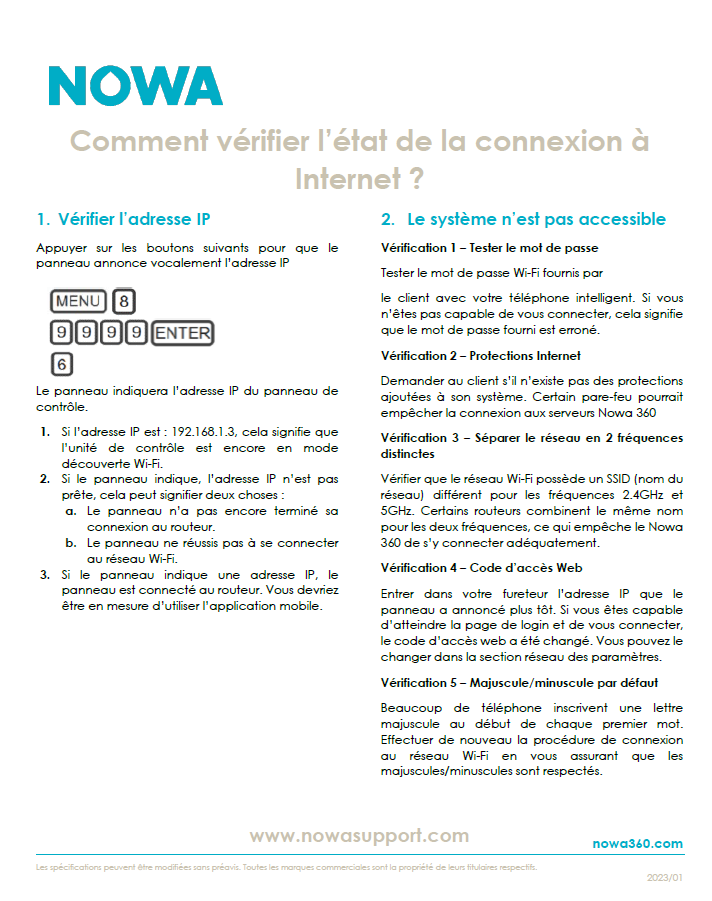 Ce document vous explique les différents obstacles que vous pourriez rencontrer lorsque vous tentez de vous connecter au système Nowa 360 via Internet.