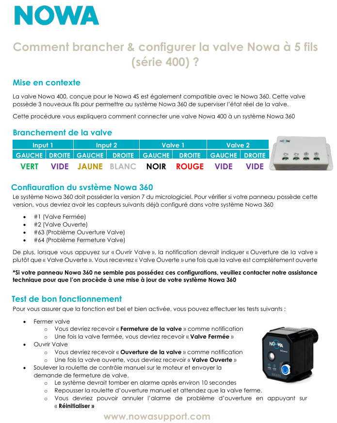 La valve Nowa 400, conçue pour le Nowa 4S est également compatible avec le Nowa 360. Cette valve possède 3 nouveaux fils pour permettre au système Nowa 360 de superviser l’état réel de la valve.