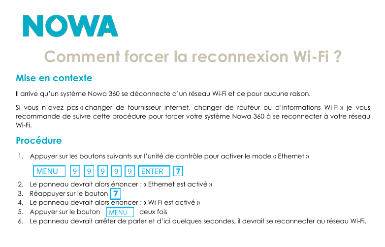 Si vous n’avez pas « changer de fournisseur internet, changer de routeur ou d’informations Wi-Fi » il est recommandé de suivre cette procédure afin de forcer votre système NOWA 360 à se connecter de nouveau à votre réseau Wi-Fi.