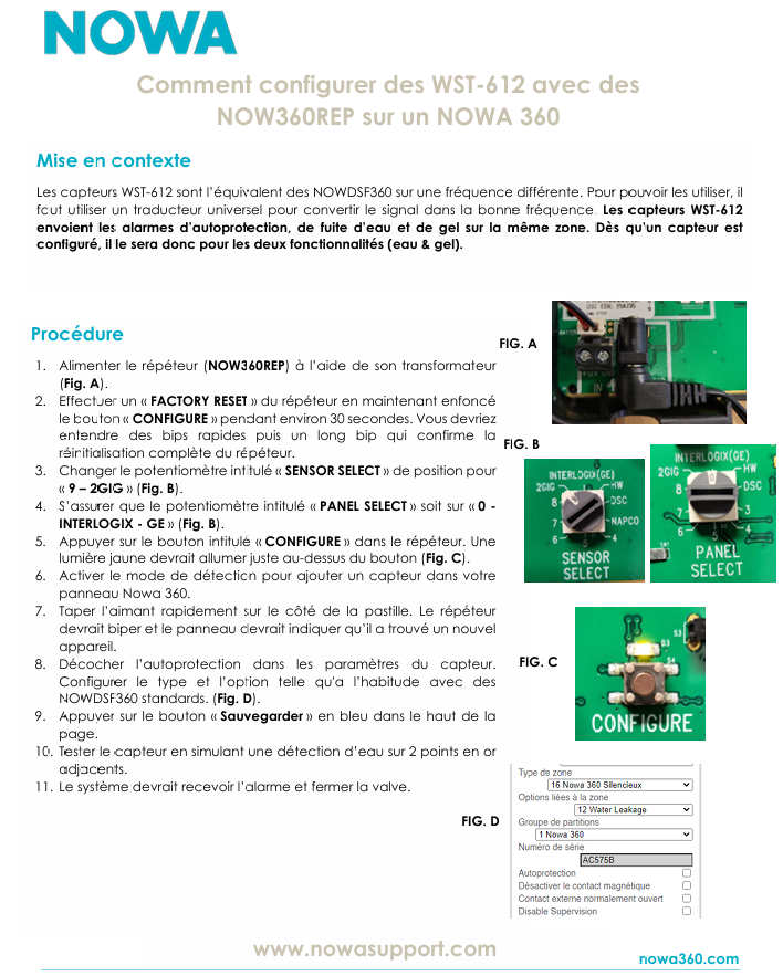 Les capteurs WST-612 sont l’équivalent des NOWDSF360 sur une fréquence différente. Pour pouvoir les utiliser, il faut se servir d'un traducteur universel pour convertir le signal dans la bonne fréquence. Les capteurs WST-612 envoient les alarmes d’autoprotection, de fuite d’eau et de gel sur la même zone. Dès qu’un capteur est configuré, il le sera donc pour les deux fonctionnalités (eau & gel).